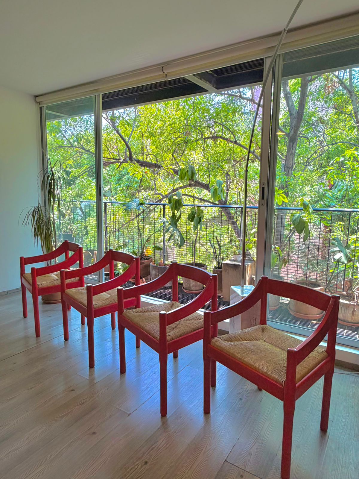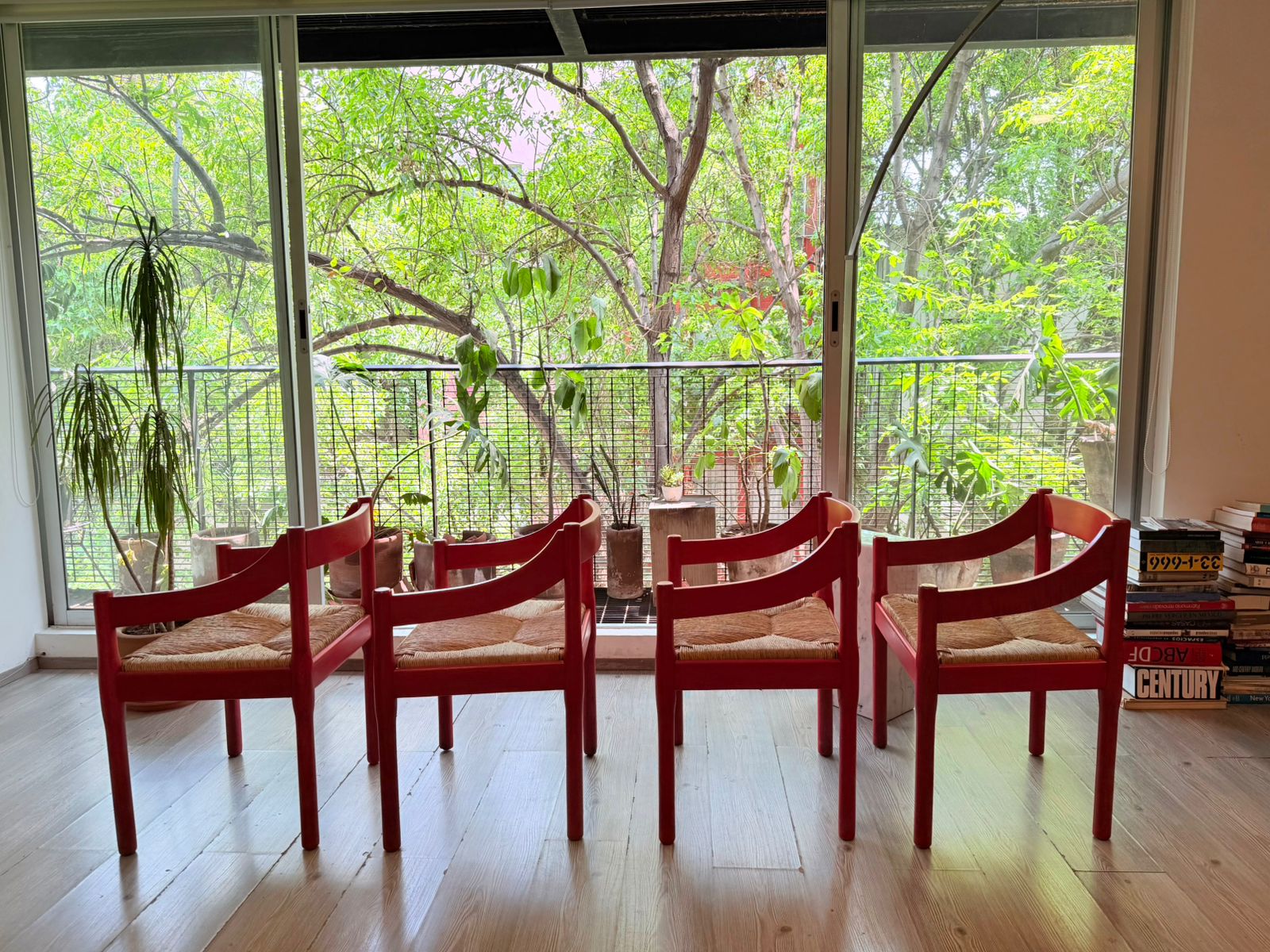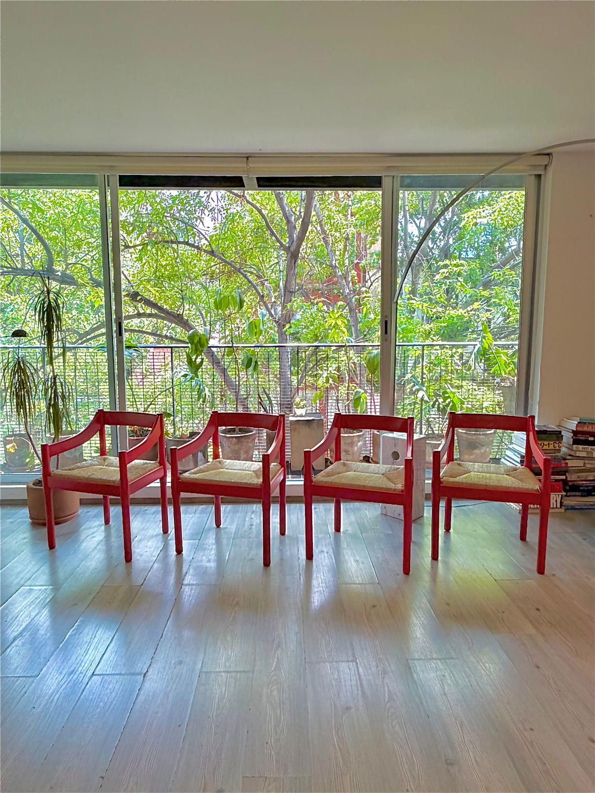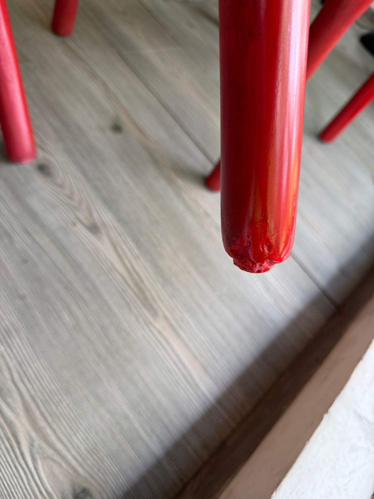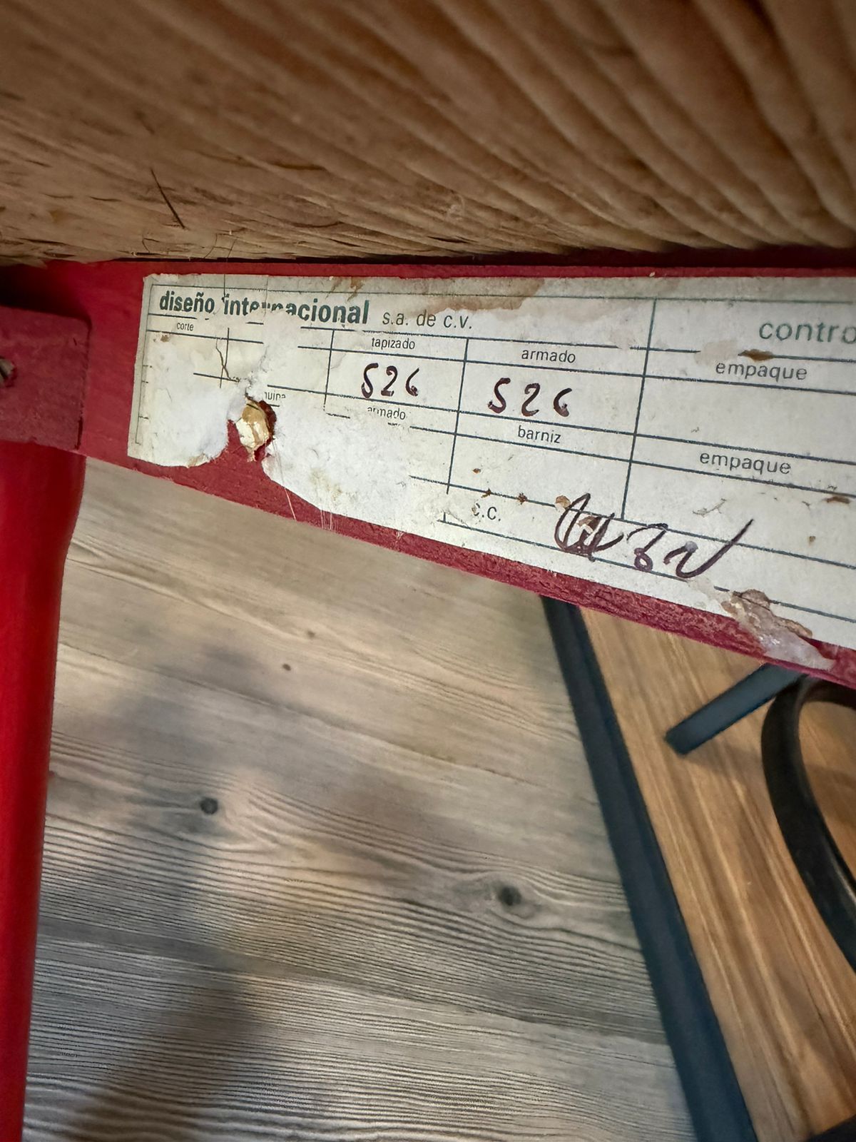 Madera de haya laqueada color rojo y asiento tejido con palma