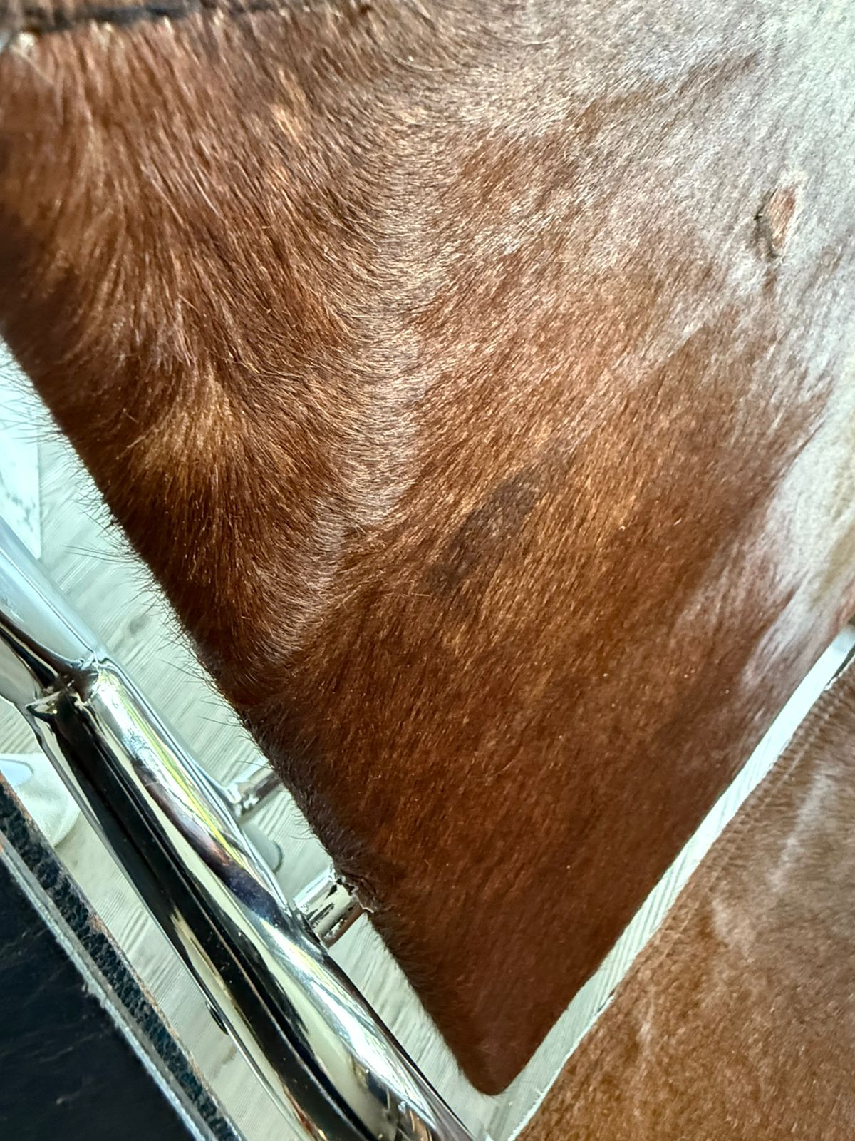 Piel con pelo vacuno color cafe (cowhide) , cuero color negro con marcas de uso-tiempo